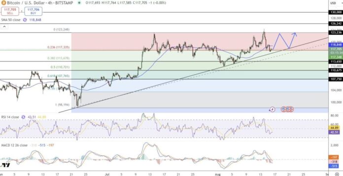 The expectations of Bitcoin prices remain ascending due to the cohesion of the price around $ 118,000 and the maintenance of its main support. The four -hour graphic graphic shows its survival at the top of the upward trend extending since the end of June, which suggests that the Bulls (rackets increasing) take control of the initiative despite the price of the price with a wave of stability.