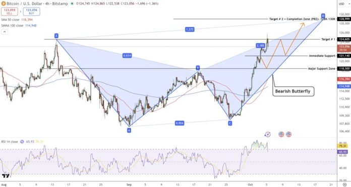 As mentioned in my previous forecasts, Bitcoin followed the path perfectly – rallying around $ 124.6k with the low -cut butterfly motif.
