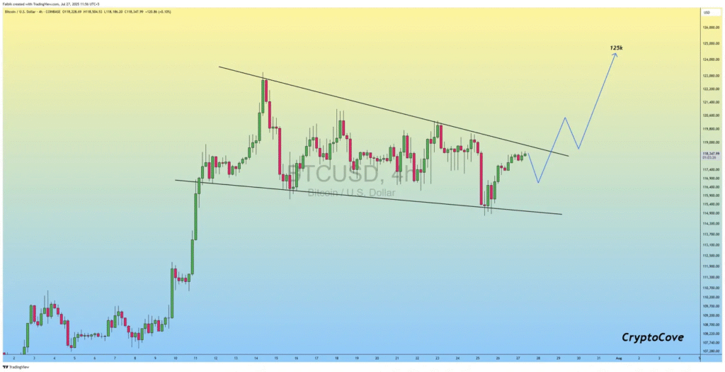 As part of the 4 -hour setting, the Bitcoin currency price graphic reveals the formation of a downstream style style, because the price is currently testing the style greater than around $ 118,347.