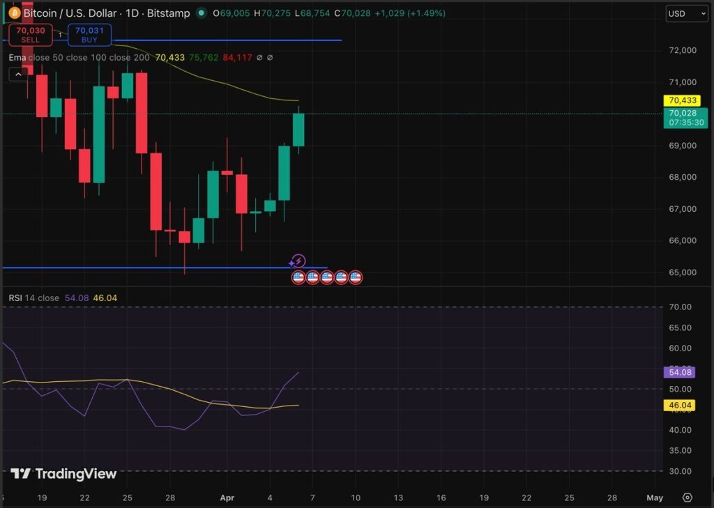 A daily close above $69,500 sets the stage for $72,000, and perhaps the $74,000 zone it briefly traded in mid-March. The catalyst for this could be weaker-than-expected U.S. employment or inflation data, which would change interest rate expectations from the Federal Reserve.