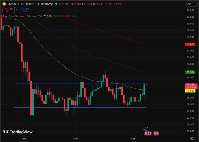 The technical configuration seems clear; Bitcoin is currently pressing the resistance zone between $71,000 and $71,500, which is the area that corresponds to the 200-period exponential moving average (EMA) on a 4-hour time frame. The Relative Strength Index (RSI) also showed a decisive upward move above the 14-period moving average, approaching the 60 level, a historical threshold that typically precedes an acceleration in momentum.