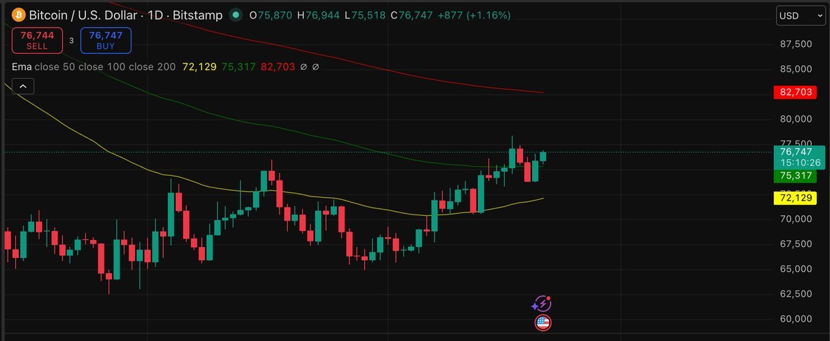 Bitcoin’s technical setup looks constructive after price consolidation phase; The price maintains its stability above $74,000, an increase of 10% in a month, while building bullish momentum from the last high. Key resistance lies at $78,000, and a confirmed close above this level would open the door for a breakout of $80,000.