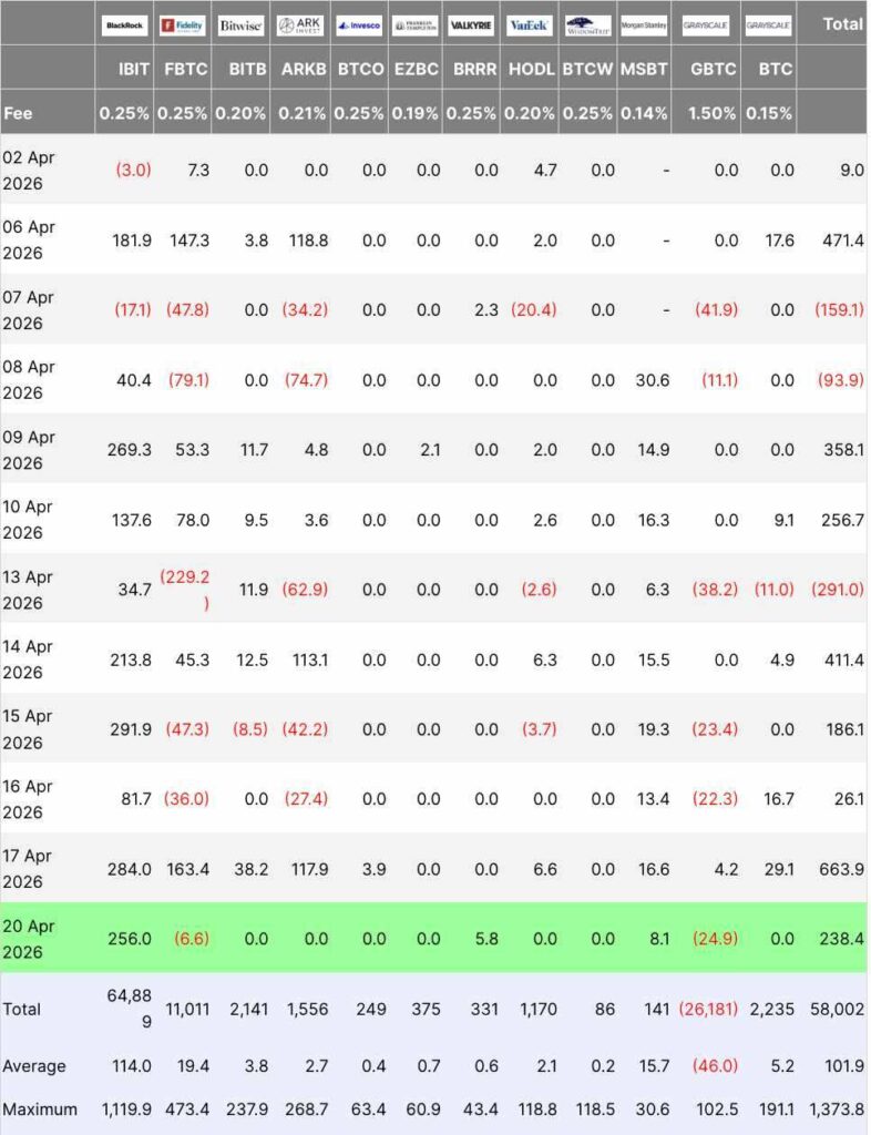 Collectively, US Bitcoin spot funds saw $1.9 billion in net inflows over the same five days, the strongest weekly performance since early February. April 17 was the biggest day, with total fund flows reaching $663.89 million, of which the IBIT fund alone acquired $283.96 million, while Fidelity’s FBTC fund added another $163 million.
