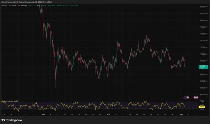 Bitcoin’s price fell to nearly $66,500, losing about 6% of its value in a matter of hours, after President Trump’s April 1 speech foreshadowed more forceful military strikes against Iran in the coming weeks, shattering the fragile optimism that had briefly wiped out risk assets.