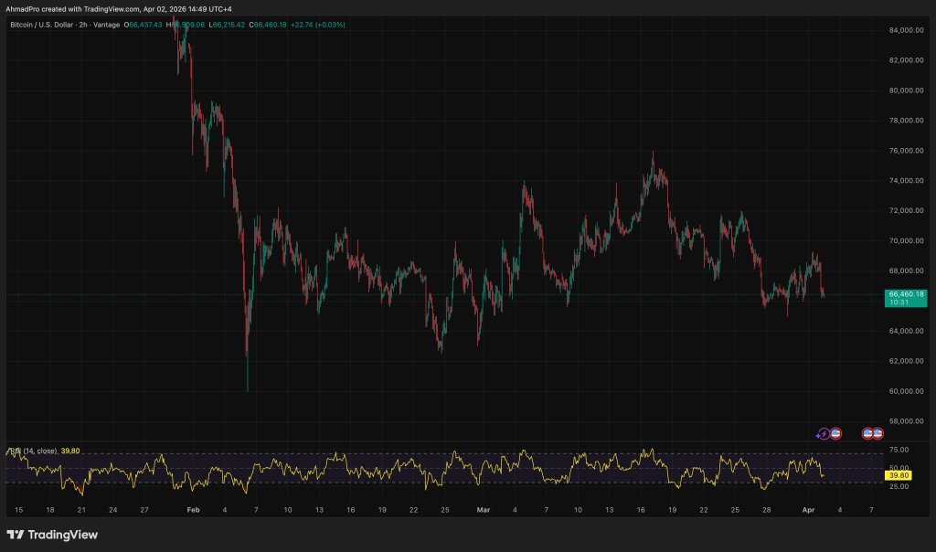 Bitcoin currently sits at $66,500, stuck in a downtrend from March’s high at $76,000, as each recovery attempt weakens and selling pressure limits each rebound before it begins to gain momentum.