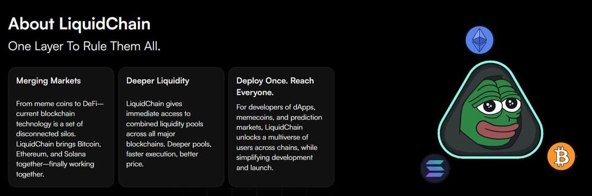 That works Liquid Chain We are building a Layer 3 network on top of existing Layer 2 systems, focusing on DeFi and gaming use cases. The project aims to connect the Bitcoin, Ethereum and Solana networks into a unified implementation layer that includes the three largest blockchain ecosystems.