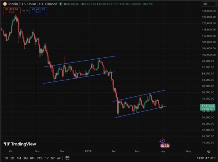 Bitcoin fell 4% in October, 18% in November and 3% in December, followed by a 10% drop in January and 15% in February, while March is currently down just 1%. A close below $67,300 would officially mark the sixth consecutive red candle.