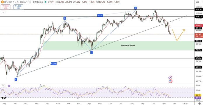 Bitcoin price continues to face strong selling pressure as it trades near $91,000 with a corrective ABCD pattern forming on the daily chart. This harmonious structure – known as the harmony of the range of price movements – indicates the possibility of the trend ending near $83,800, a key area of demand that has already spurred strong rebounds in early 2024.