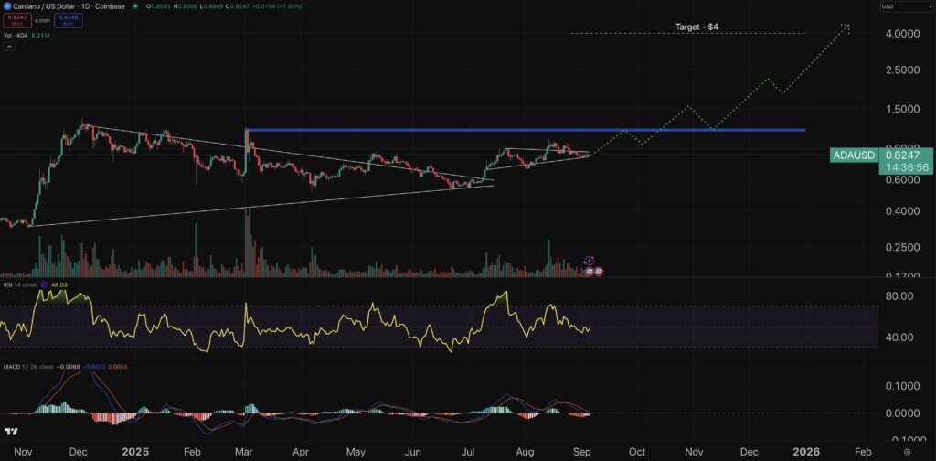 Cardano’s price today has returned to $ 0.826, an increase of 1% within 24 hours and 13% in one month. Despite his decline last week, his expectations remain very positive because he is still far from his historic summit of $ 3.09 he reached in September 2021.