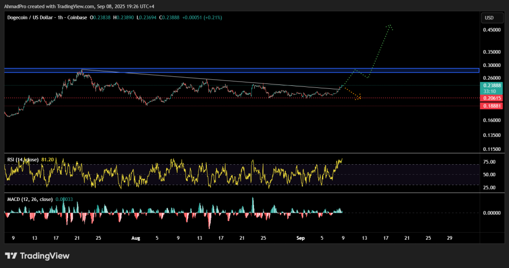 The price of the Dogoin currency is currently trying to penetrate the downward trend line (in white in the graphic table above), which is like the main resistance wall for weeks, and if the price manages to hack and stay above, the next real test will become the resistance zone at $ 0.26 and $ 0.30.