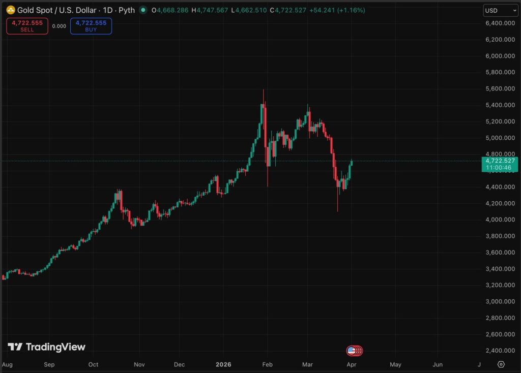 The current rally has spot gold near $4,700, up 1.5% on the day. This number looks solid when considering in isolation the 13% pullback seen in March from previous highs above $5,000.