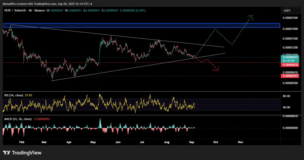 Consequently, the PEPE currency price system is currently in a pivotal support area, because the price touches the upward trend line while it remains stuck under the downstream resistance line. The support levels are clearly emerged at 830, then deeper to 600, while the main resistance awaits it between 1,900-2,500.