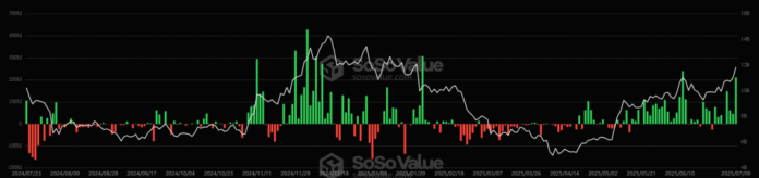 After the launch of 9 immediate negotiation boxes against Bitcoin (Bitcoin Spot ETF) in January 2024, its Ethereum counterpart on the stock market started in July 2024, and the graph is presented below the investment levels below these boxes since their launch (in red and green), as well as the total value of their total assets (white).