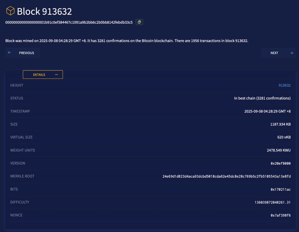 Source: https://btcScan.org/block/00000000000000001B91C0EF384467C1091A9B2BB6C2B0BB8142FEBDB3C5?EXPAND