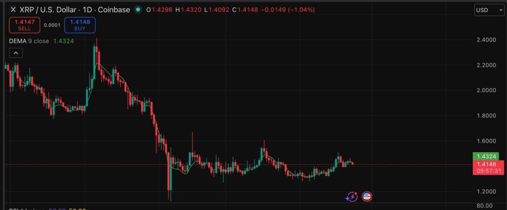 The technical structure of XRP is currently showing unusual clarity. Price is holding within the $1.40 range, trading above the 50-day exponential moving average (EMA) at $1.35, and with a comfortable gap above the 100-day EMA at $1.37, both acting as former resistance levels turned into support.