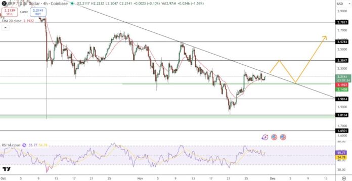 The latest rebound in Ripple (Ripple) price began after the market managed to defend the demand zone around $2.14, an area that was repeatedly tested throughout November, and the 4-hour price movement chart shows that it is about to retest a descending trendline, forming a symmetrical triangle, which reflects a period of stability in which the price is preparing for a strong launch that determines its next destination.