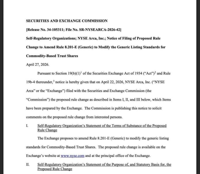 The United States Securities and Exchange Commission (SEC) opened a public comment period on April 27, 2026 on an 85-provision rule change from NYSE Arca that would establish a strict minimum eligibility of 85% of assets to be included in cryptocurrency and commodity trusts, which would directly impact how Bitcoin and XRP products qualify for exchange approval.