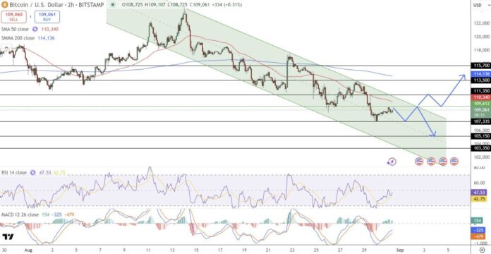 Bitcoin has been traveling since mid -August in a Dessig The two Bitcoin price movements at two hours show its stability around $ 109,000 after testing the support level of $ 10,300.