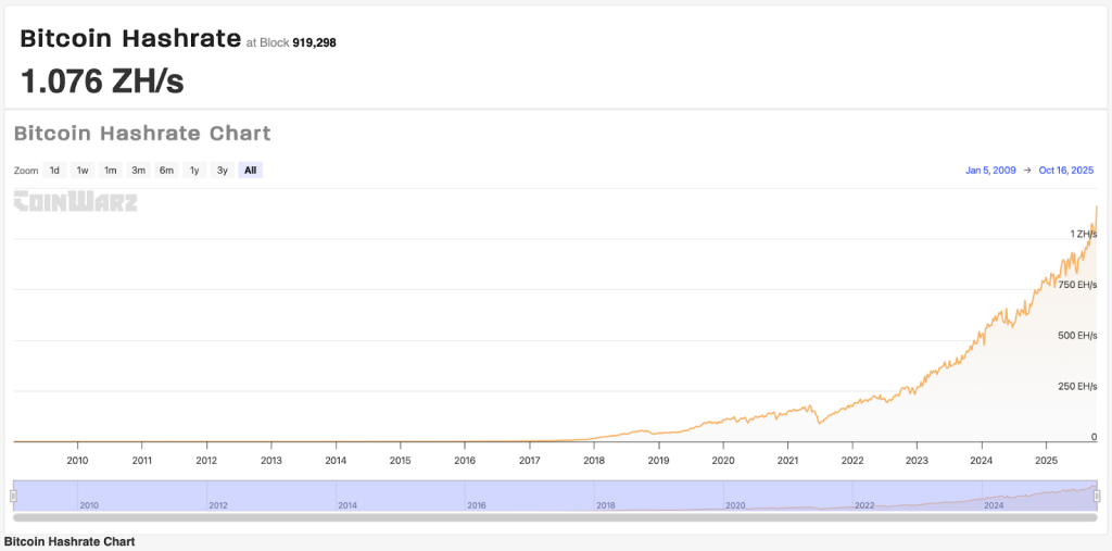 The hash rate of the Bitcoin blockchain is approximately 1.0 sextillion hashes per second (ZH/s), or over a trillion terahashes competing to mine 144 blocks per day. This is equivalent to buying one lottery ticket out of 10 to 11 million tickets every 10 minutes.