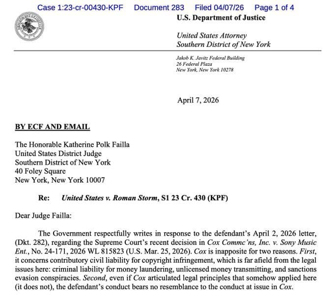 The Justice Department’s letter to Judge Failla confirmed that Cox Inc. I fought actively illegal behavior occurring on its network, while Storm and its partners at Tornado Cash did the exact opposite.