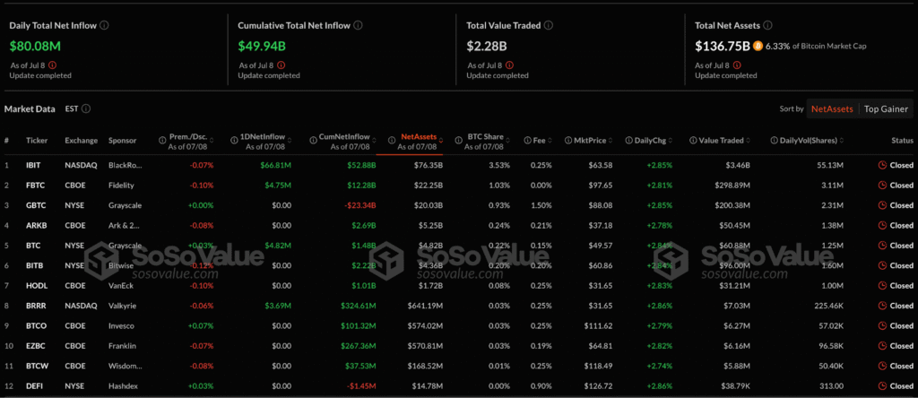 In recent weeks, the institutional interest in Crapto assets has increased according to the reports of the Coinshares website, as well as immediate negotiation funds for Bitcoin Spot ETF in US scholarships and net daily investments of 80.08 million dollars until July 8, to reach total net investments have received $ 49.94 billion and the total value subject to These funds 13655 6.33% of the market value of Bitcoin, according to Sosovalue.