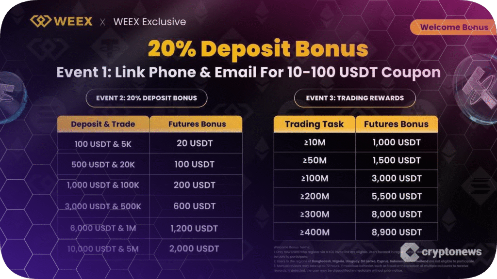 WEEX, a cryptocurrency exchange known for its secure and highly liquid trading, has launched a three-part welcome program for new users: a sign-up coupon worth between $10 and $100, a 20% deposit bonus, and tiered futures trading bonuses of up to $8,900.
