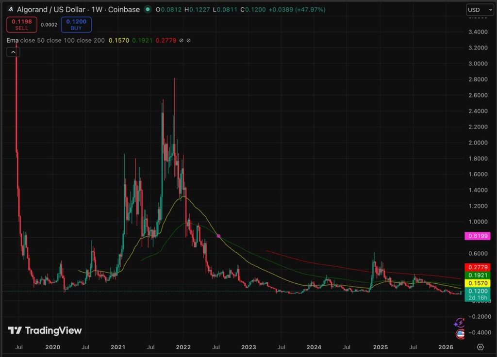 Support now stands at $0.082, representing the previous wedge base and horizontal shelf. As resistance nears $0.115 to $0.12, this is the area where sellers from the previous range are likely to concentrate. The market cap is around $930 million, still less than $1 billion, meaning any sustained institutional rotation could move the price aggressively. But it should be remembered that ALGO is still 96% below its 2019 high when it was launched.